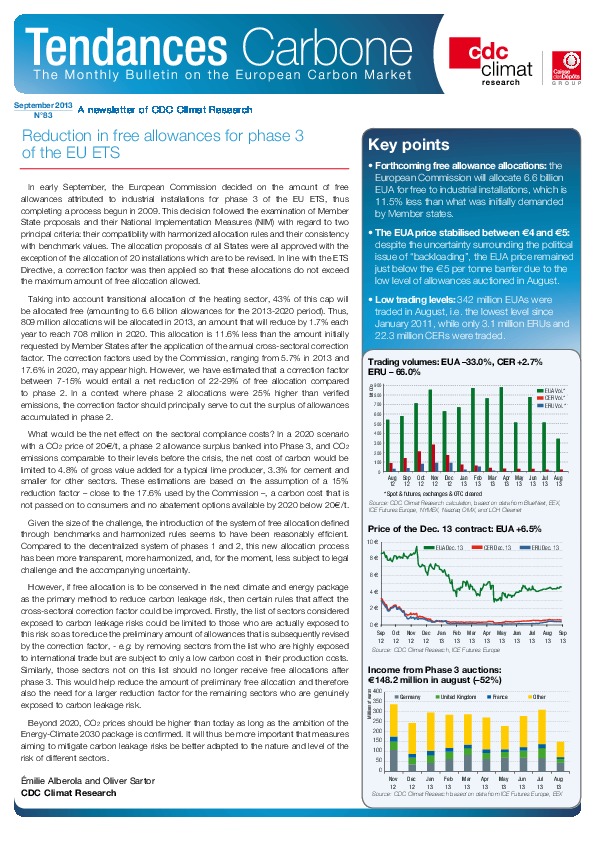 - The EUA price stabilised between €4 and €5: despite the uncertainty surrounding the political issue of “backloading”, the EUA price remained just below the €5 per tonne barrier due to the low level of allowances auctioned in August.