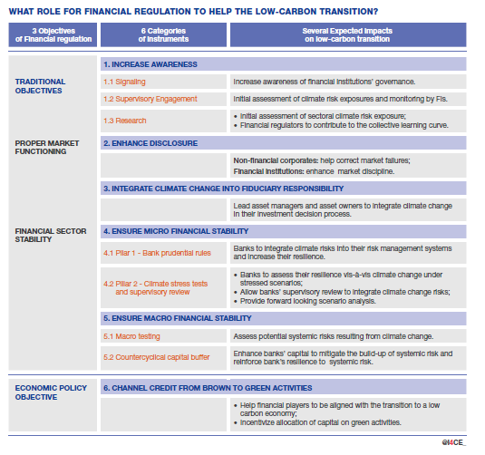 Ensuring a proper market functioning and financial stability are the traditional objectives of financial regulation, and there is now broad agreement among regulators that regulation needs to evolve to better address climate issues, through the integration of climate risks for instance. However, these developments can be seen as insufficient in view of the climate urgency and the question is whether financial regulation could and should also pursue macro-policy objectives such as redirecting financial flows towards “green” activities at the expense of “brown” activities. This is a highly controversial debate, and one that should not be considered as closed: financial regulation has already been extended in many countries to economic policy areas such as consumer protection and financial inclusion.
