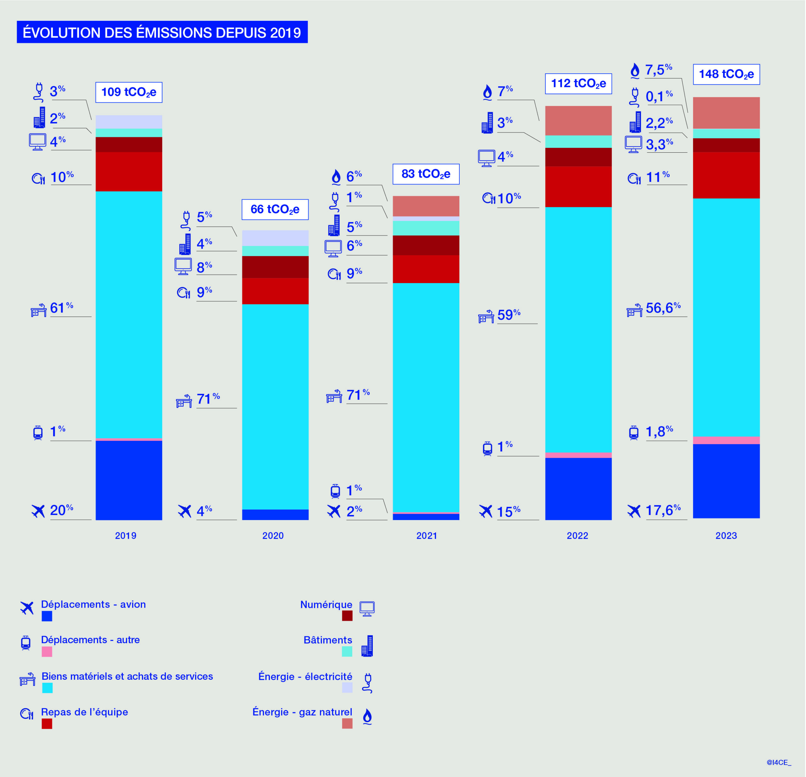 Le bilan carbone 2023 montre que l’Institut a émis 148 tCO2e, soit 3,8 tCO2e par an et par salarié.