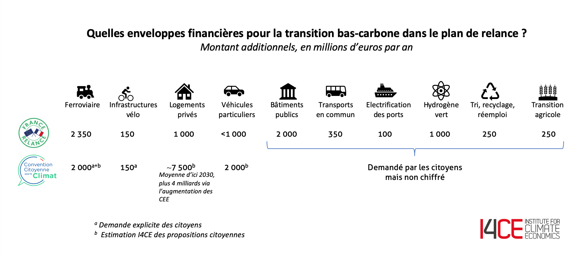 Le plan de relance dévoilé la semaine dernière fixe l’enveloppe financière supplémentaire allouée à la transition bas-carbone pour les deux prochaines années. Permettra-t-elle au gouvernement de répondre aux demandes de la Convention citoyenne ? Après avoir évalué avant l’été les coûts pour les finances publiques des mesures réclamées par les citoyens, Quentin Perrier d’I4CE les compare dans ce billet aux montants attribués à chaque secteur par le plan de relance. Résultat : si le gouvernement et les citoyens s’accordent sur les montant financiers dans plusieurs secteurs, on observe aussi des écarts importants dans d’autres et parfois de profondes différences dans la manière de dépenser l’argent public.