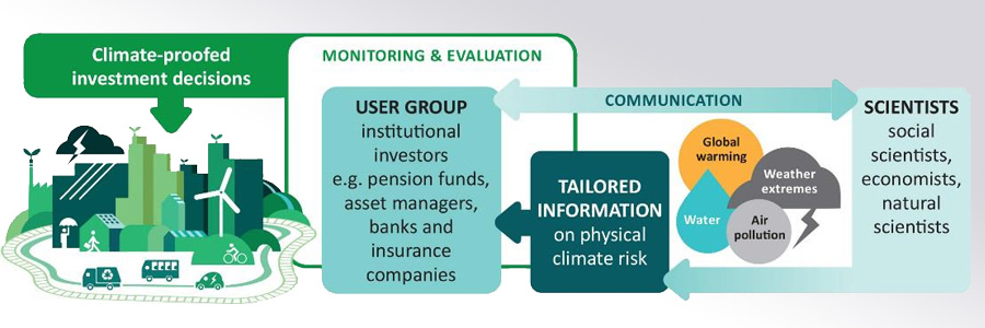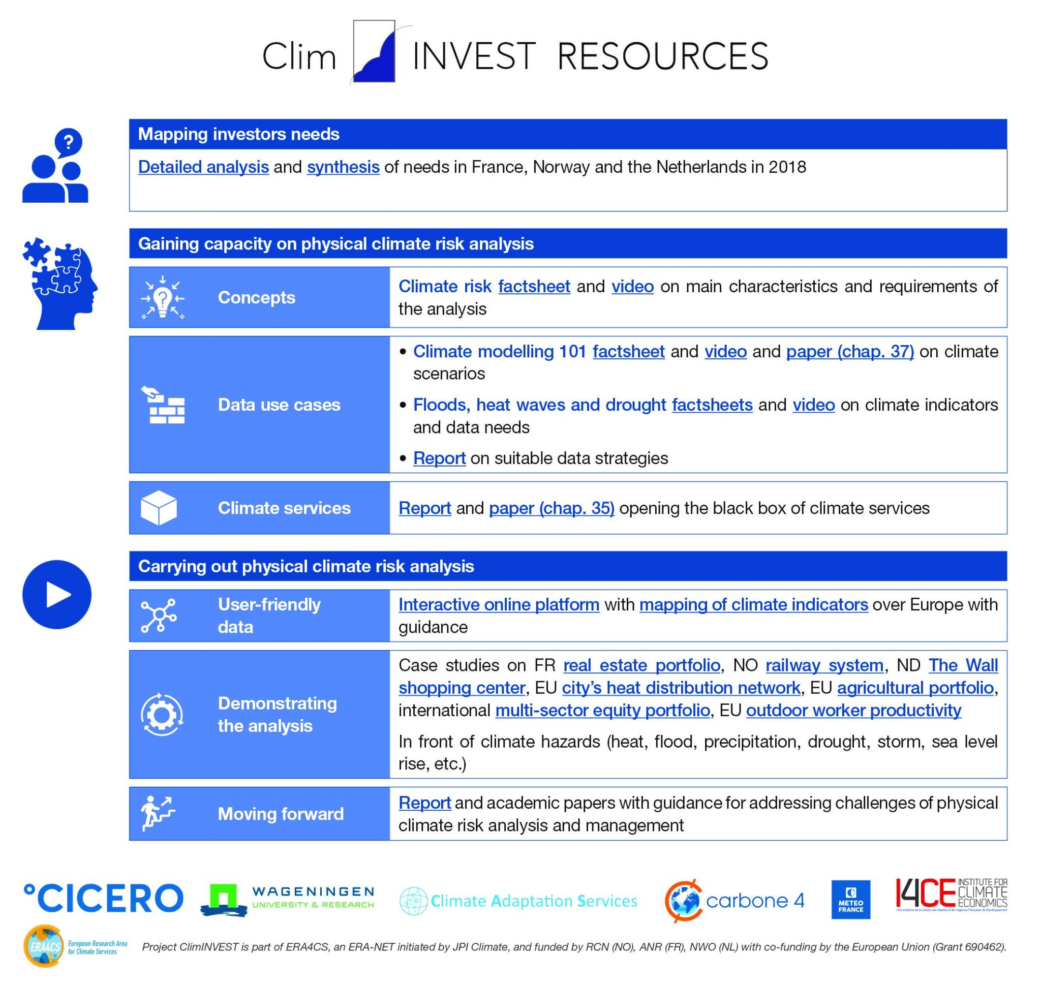 Le projet européen ClimINVEST a organisé la collaboration directe entre experts du climat et institutions financières pour identifier et relever les challenges de l’intégration des risques climatiques physiques en finance. Il en résulte une gamme de ressources publiques, accessibles par la figure ci-dessous.