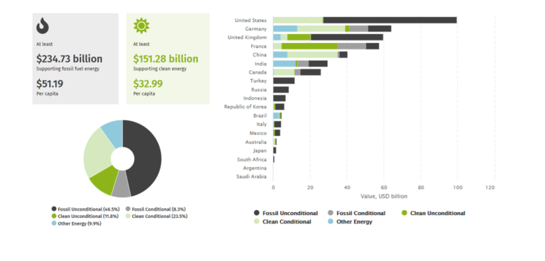 Le projet à but non lucratif Energy Policy Tracker fournit des informations sur les engagements de fonds publics pour différents types d’énergie, ainsi que sur d’autres politiques soutenant la production et la consommation d’énergie. La recherche suit une approche ascendante, qui implique la collecte de données sur les différentes politiques au niveau de chaque pays, puis leur agrégation.