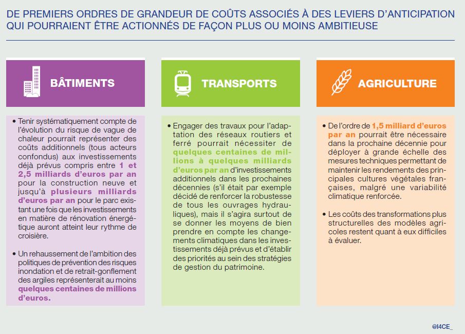 3 – Des options d’anticipation sont bien identifiées et pourraient être mieux déployées. Il s’agit par exemple de privilégier des modes de construction sobres et des choix architecturaux adaptés pour des bâtiments confortables l’été même sans climatisation ; de renforcer certains ouvrages ou d’organiser autrement la maintenance pour améliorer la robustesse et la résilience des infrastructures ; d’ajuster certaines pratiques culturales ou de généraliser des mesures agroécologiques pour limiter l’effet de la variabilité climatique sur les productions agricoles. Ces options peuvent parfois être mises en œuvre avec des coûts limités – notamment en intégrant l’adaptation dans les cahiers des charges des investissements déjà prévus. Parfois elles représentent un surcoût voire demanderont la mobilisation de moyens dédiés additionnels. On commence tout juste à avoir un ordre de grandeur des coûts associés à différents leviers d’anticipation qui pourraient être actionnés de façon plus ou moins ambitieuse. Les coûts de certaines formes d’adaptation plus transformationnelles sont en revanche difficiles à isoler.