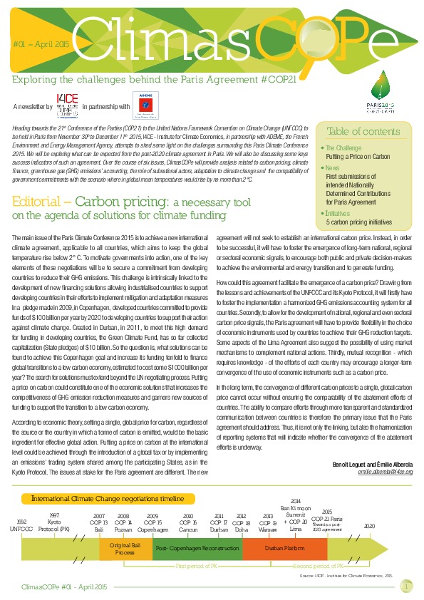 En préparation de la Conférence Climat Paris 2015 (COP 21), I4CE, en partenariat avec l’ADEME, lance en mars 2015 « ClimasCOPe », nouvelle publication visant à éclairer les décideurs publics et économiques sur les enjeux de cette négociation climatique internationale. Publiée en six numéros jusqu’en novembre 2015, ClimasCOPe présentera, à chaque numéro un dossier thématique synthétique et pédagogique de quatre pages pour décrypter les enjeux principaux de la COP21.