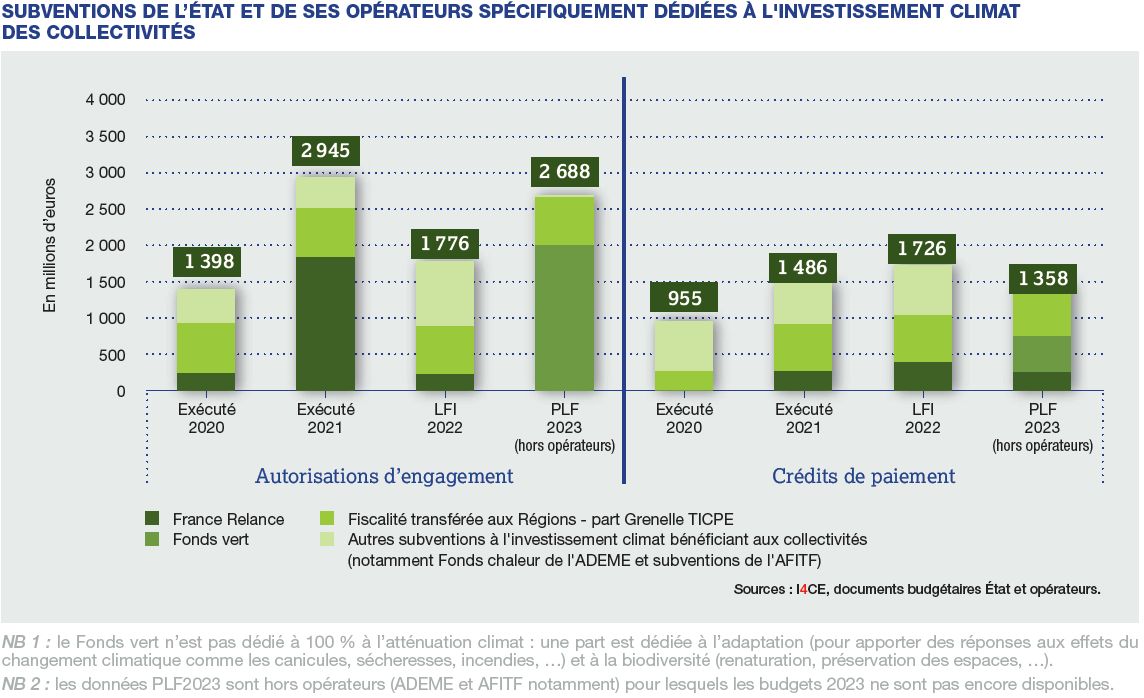Bien qu’en hausse, les subventions et dotations de l’État (et de ses opérateurs) directement dédiées aux actions climat des collectivités ne constituent qu’une faible part des sources de financement de leurs investissements. Dès lors, le « Fonds vert », s’il envoie un signal positif aux porteurs de projet, ne peut constituer une réponse à la hauteur de l’enjeu d’accélération des actions climat des collectivités. Le caractère pérenne des financements directement dédiés à la transition écologique au sein du Fonds vert n’est par ailleurs pas garanti.