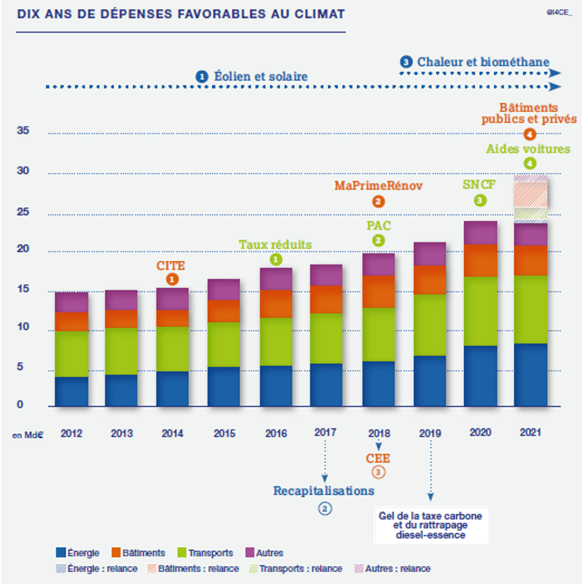 A travers les nombreuses évolutions, on peut distinguer trois faits marquants. La première est l’augmentation des aides pour le bâtiment à partir de 2014, suivie de nombreuses réformes après 2017 pour en améliorer l’efficacité et les recentrer sur les ménages modestes. La seconde est l’augmentation des aides pour la mobilité bas-carbone, avec l’augmentation de la prime à la conversion et du bonus automobile à partir de 2018 – malgré une efficacité climat parfois discutable -, puis le rachat de la dette de SNCF en 2020. La troisième est le soutien aux énergies renouvelables électriques – éolien et solaire – sur la décennie, avec plus récemment un essor du biométhane ou encore de l’hydrogène.