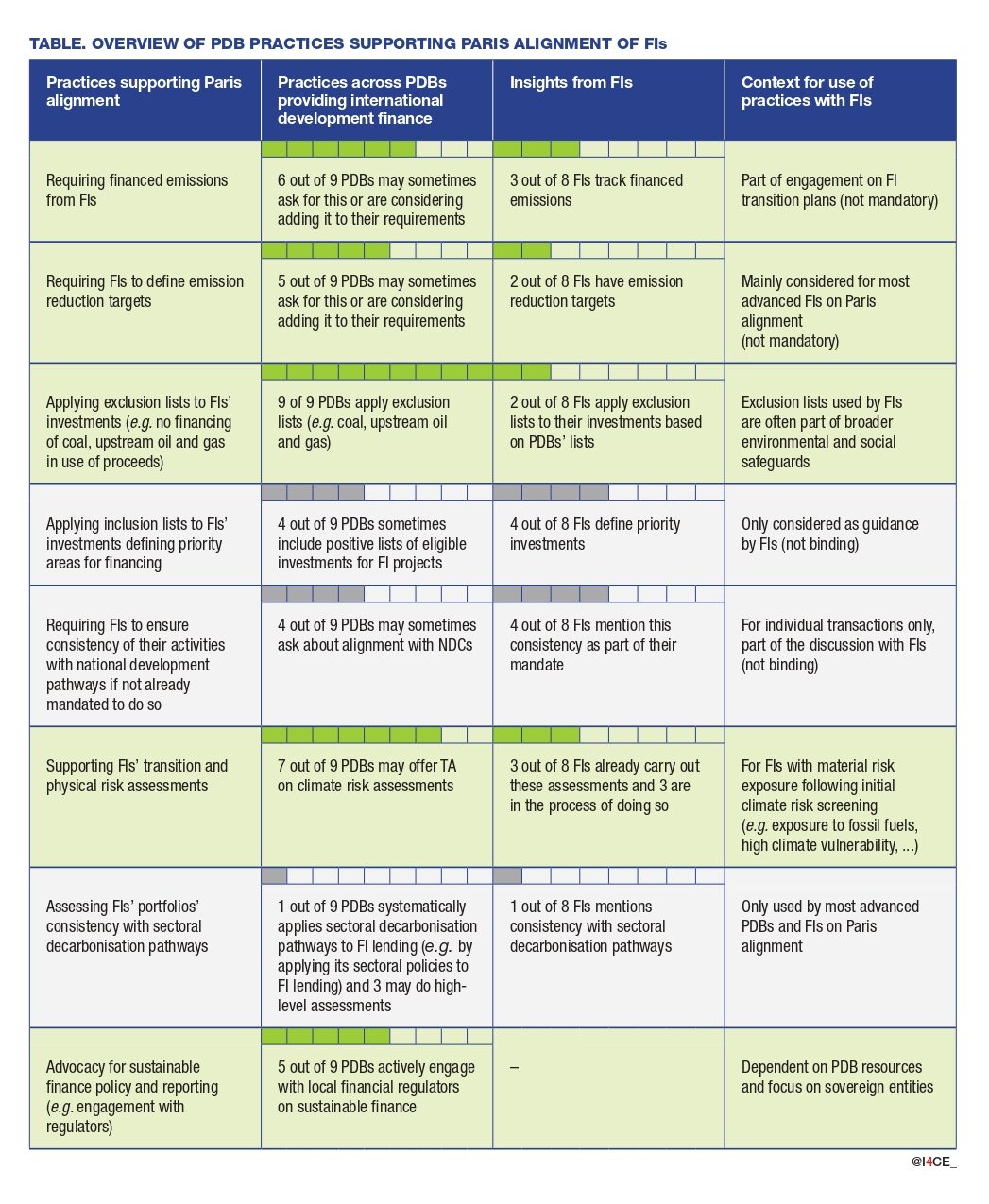 - PDBs need to systematically consider how engagement with FIs can support improvement in their practices (g. through results-based financing, dialogue on Paris alignment and priority areas for investment and institution-level transition, application of E&S safeguards …) and further influence FIs’ practices, prior to disbursement as well as throughout the relationship with the FI;