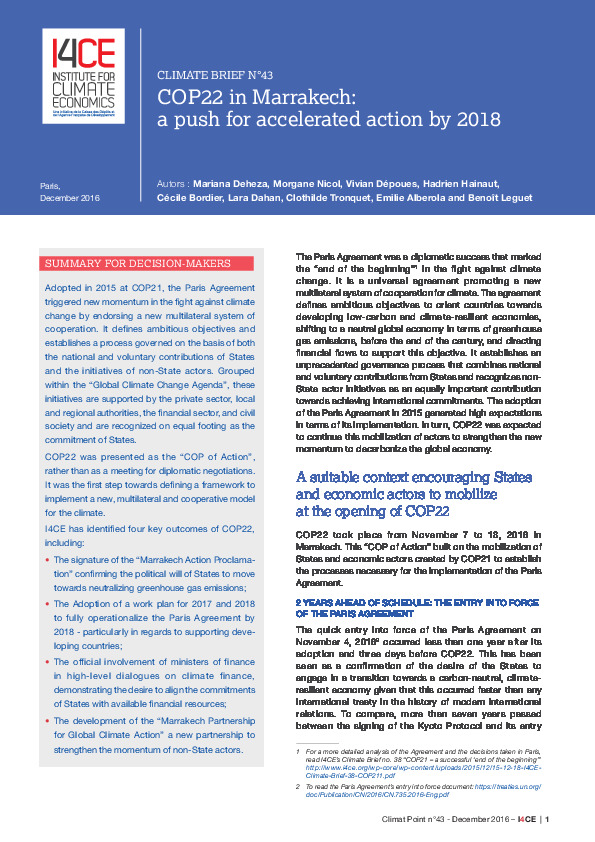 - Avec l’entrée en vigueur anticipée de l’Accord de Paris, les discussions internationales sur le climat entrent à nouveau dans un cycle moins politique et plus technique dont le pas de temps différent devrait nous mener jusqu’en 2018 pour mettre en place l’ensemble des dispositifs (de transparence, de progression continu, de financement, etc.) prévus lors de la COP21;