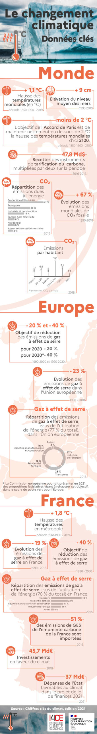 Le Ministère de la transition écologique et solidaire et I4CE – l’institut de l’Économie pour le climat- publient l’édition 2021 du « Datalab – Chiffres clés du climat – France, Europe et Monde ». Cette publication, par son organisation et le choix des thèmes abordés, a pour ambition d’informer un public le plus large possible sur le changement climatique, ses mécanismes, causes et effets ainsi que sur les dispositifs mis en place pour le circonscrire, aux échelles internationale, européenne et nationale. Elle fournit en particulier des statistiques détaillées sur les émissions de gaz à effet de serre dans le monde, en Europe et en France.