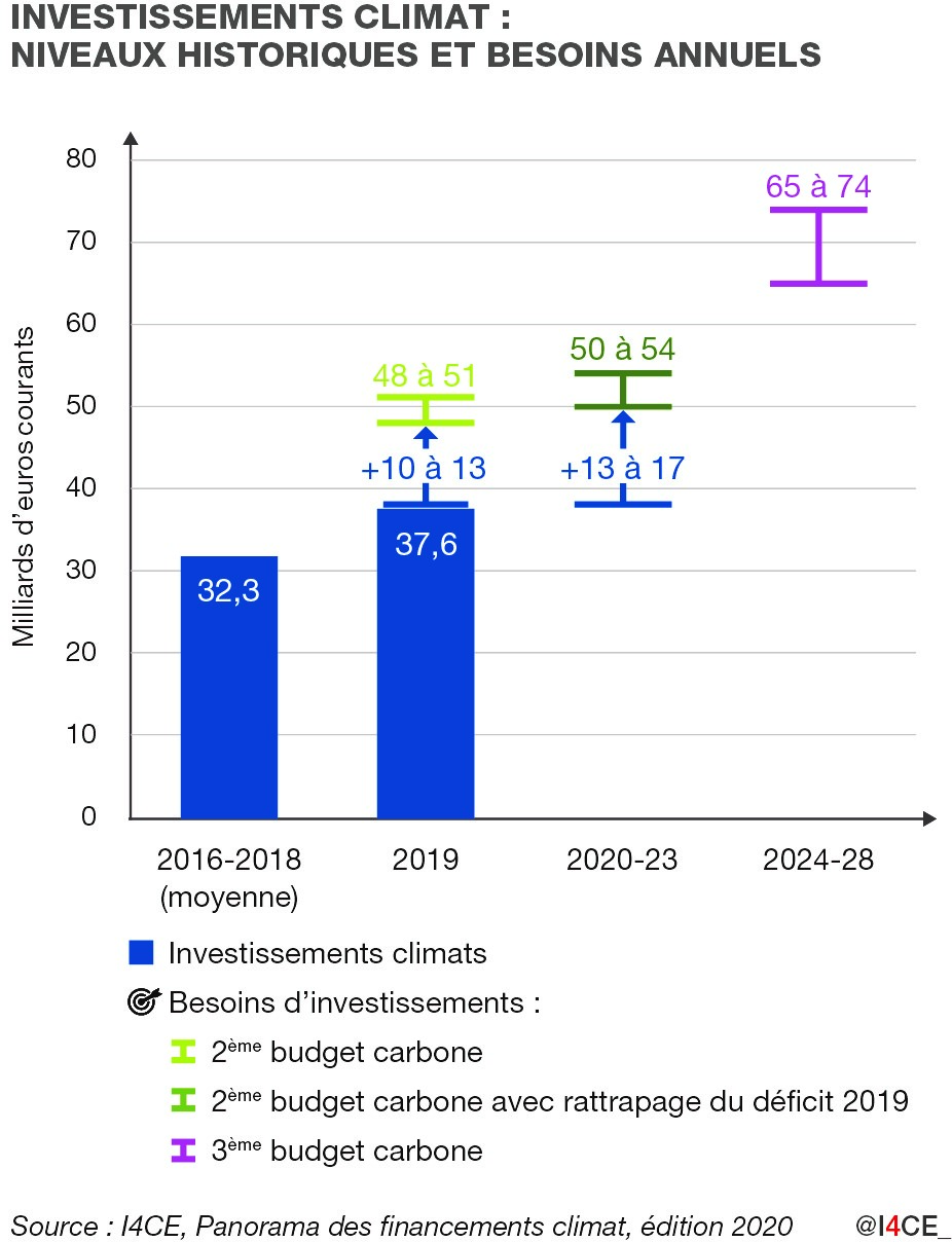 Malgré leur croissance récente, les investissements climat restent insuffisants au regard des besoins. Ce déficit s’explique, entre autres, par le manque de rentabilité des projets, des freins réglementaires, ou par l’absence d’offre de financement adéquate. Pour rattraper le retard sur la trajectoire de la stratégie nationale bas-carbone, il faudrait investir chaque année 13 à 17 milliards d’euros de plus qu’en 2019 dans les secteurs du bâtiment, des transports et des énergies renouvelables. Et pour espérer atteindre à terme la neutralité carbone, il faudrait envisager des besoins encore mal documentés, dans l’agriculture, l’industrie, la recherche ou encore l’adaptation. Et il est encore trop tôt pour savoir si le plan de relance et son volet climat, adopté en septembre 2020, a permis d’accroitre les investissements climat et de rattraper ce retard.