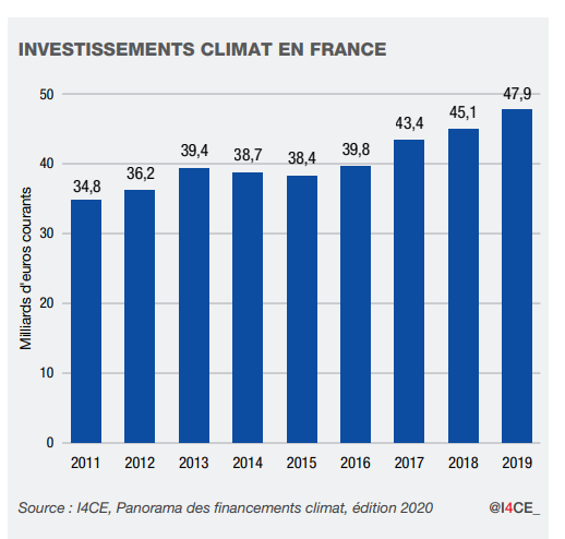 Avant la crise, les investissements climat augmentaient rapidement, pour atteindre 48 milliards d’euros en 2019. Ils sont surtout réalisés dans les secteurs du bâtiment, des transports et de la production d’énergie. Parmi les leviers de réduction des émissions de GES, c’est l’efficacité énergétique qui vient en premier avec 40% des investissements totaux.