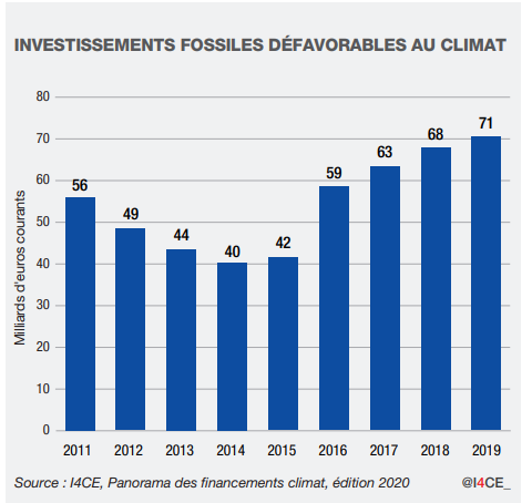 Les investissements fossiles augmentent encore en 2019, et atteignent un niveau record de 71 milliards d’euros, soit 70% de plus qu’en 2014. Il s’agit surtout d’investissements dans les équipements de consommation : à elles seules, les voitures particulières représentent près des deux tiers du total. Ces investissements vont à l’encontre des efforts en faveur de la transition en retardant la réduction des émissions de GES, mais les pouvoirs publics auraient des moyens fiscaux et réglementaires pour les réduire.