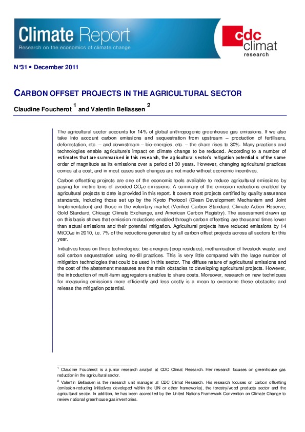 En rémunérant les émissions évitées, les projets de compensation carbone sont l’un des outils économiques disponibles pour réduire les émissions agricoles. Le bilan des réductions d’émissions permises jusqu’à présent par les projets agricoles est présenté dans cette étude. Elle couvre l’essentiel des projets certifiés par des labels de qualité, aussi bien ceux établis par le protocole de Kyoto (Mécanisme pour un Développement Propre et Mise en OEuvre Conjointe) que ceux du marché volontaire (Verified Carbon Standard, Climate Action Reserve, Gold Standard, Chicago Climate Exchange et American Carbon Registry). Le bilan ainsi réalisé montre que les réductions d’émissions permises par le biais de la compensation carbone sont plus de mille fois inférieures aux émissions et au potentiel d’atténuation. Les projets agricoles ont permis d’éviter l’émission de 14 millions de tonnes d’équivalent-CO2 (tCO2e) en 2010, soit 7 % des réductions engendrées par l’ensemble des projets de compensation carbone, tous secteurs confondus cette même année.