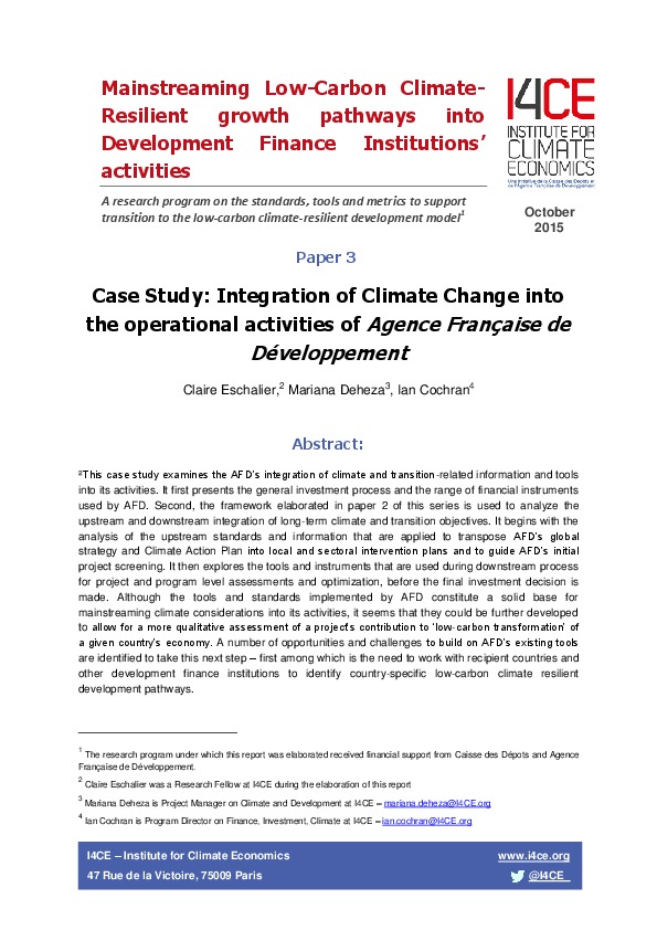 Cette étude de cas examine l’intégration des informations et des outils liés au climat et à la transition vers de des trajectoires de développement sobres en carbone et résilientes au changement climatique dans les activités de l’Agence Française de Développement (AFD). Elle dresse tout d’abord l’état des lieux du processus général d’investissement et des instruments financiers utilisés par l’AFD. Ensuite, l’étude applique le cadre d’analyse élaboré dans le deuxième papier de ce projet de recherche pour analyser l’intégration du climat en amont et en aval de l’instruction des projets et de la prise de décisions de financement au sein de l’AFD. Le rapport inclut un résumé pour décideurs ainsi qu’une présentation détaillée des instruments et outils appliqués actuellement par l’AFD et une série des recommandations des auteurs.