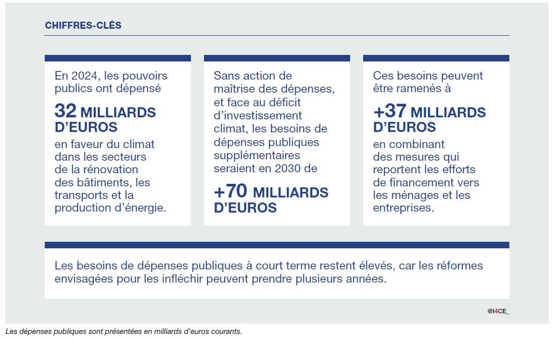 Mobiliser les financements privés ne se décrète pas. Aujourd’hui, ménages et entreprises ne trouvent pas toujours de modèle économique viable pour leurs investissements climat. Et ce que le privé ne peut pas faire, le public devra le prendre en charge. Ainsi, face au déficit d’investissement climat et sans action de maîtrise des dépenses, les besoins de dépenses publiques supplémentaires atteindraient 70 milliards d’euros en 2030.