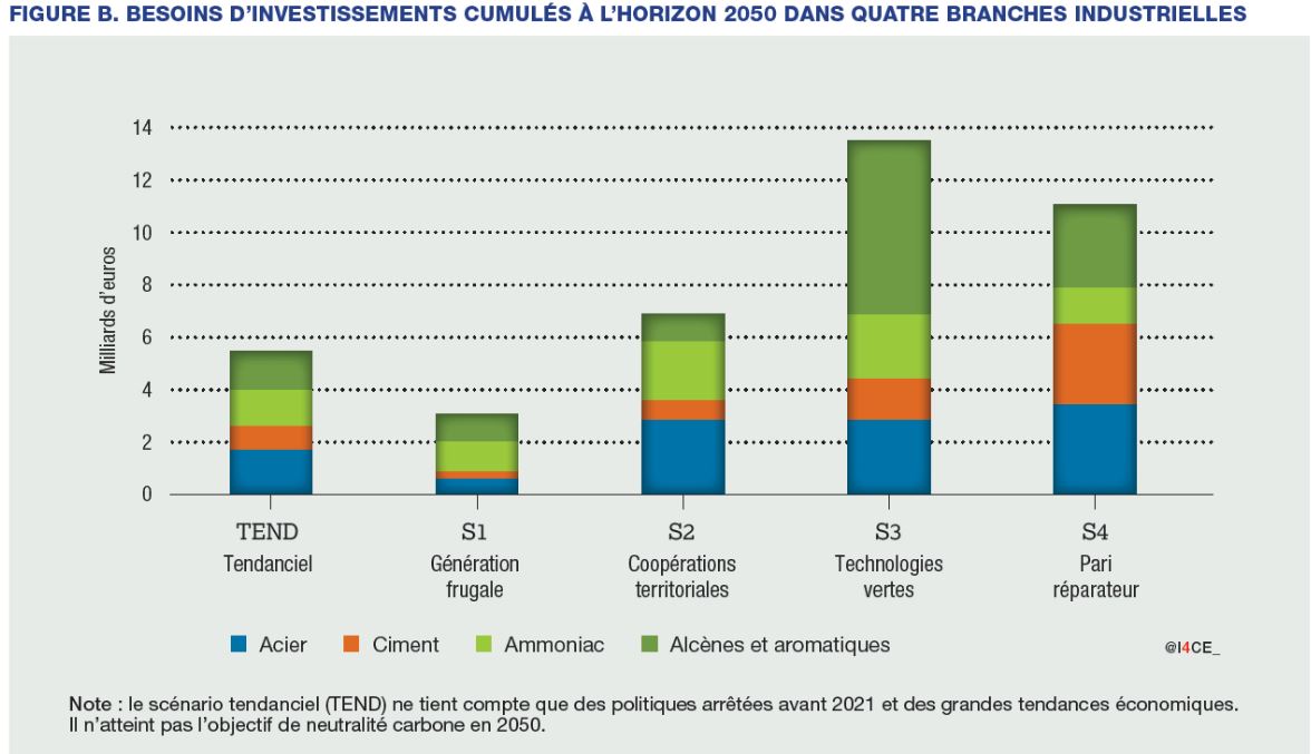 Les besoins d’investissements pour décarboner les productions d’acier, de ciment, d’alcènes et aromatiques, et d’ammoniac sont compris entre 3 milliards d’euros pour le scénario S1 « Génération frugale » de l’ADEME, et 14 milliards d’euros pour le scénario S3 « Technologies vertes ».