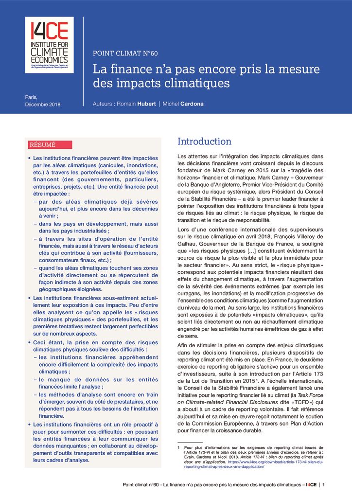 I4CE montre que les institutions financières n’ont pas encore pris la mesure des impacts du changement climatique, comme expliqué dans le Point Climat n°60.