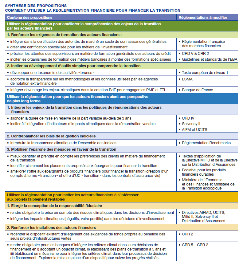 Pour chacun de ces leviers, les auteurs proposent aux régulateurs plusieurs pistes à explorer. Pour faire monter les acteurs financiers en compétences sur le climat, ils proposent ainsi par exemple de faire évoluer la certification des acteurs de marché par l’Autorité des Marchés Financiers et d’intégrer la formation dans les attentes de supervision. Ils proposent aussi d’intégrer des critères d’impact climatique dans les rémunérations variables des acteurs financiers pour qu’ils aient une perspective de plus long terme ; ou de les inciter à s’intéresser à des projets faiblement rentables en intégrant explicitement des critères climatiques dans le concept de responsabilité fiduciaire, ou en utilisant la réglementation prudentielle pour intégrer les critères climatiques dans les décisions de financement des banques.