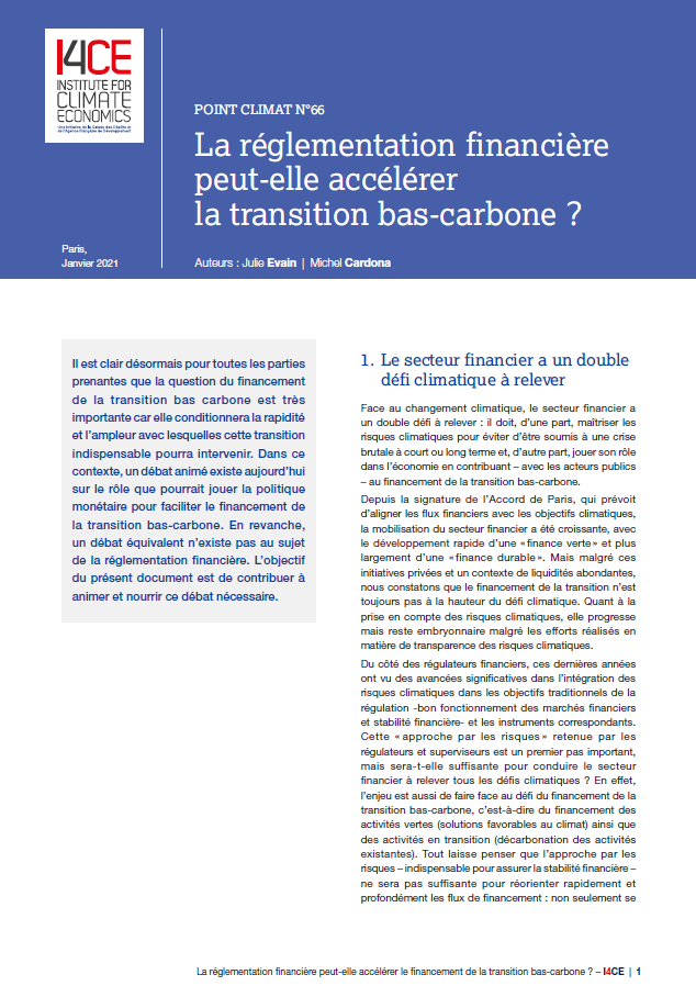 De plus en plus d’ONG ou de chercheurs appellent les régulateurs de la finance à aller au-delà de leurs objectifs traditionnels, et à chercher à contribuer au financement de la transition bas carbone. Dans les pays européens et nord-américains, le débat autour de cette question est très polarisé, les régulateurs et superviseurs y étant plutôt opposés, notamment s’agissant de la réglementation prudentielle. Mais avant de s’opposer sur la question de principe, il est nécessaire de regarder si la réglementation financière peut réellement contribuer au financement de la transition bas-carbone, et d’examiner les évolutions réglementaires qui seraient nécessaires. I4CE a donc exploré les actions concrètes que les régulateurs pourraient entreprendre pour accélérer le financement de la transition bas-carbone. Pour cela, les auteurs sont partis des obstacles réels au financement de la transition observés « sur le terrain ». Plus d’une vingtaine d’entretiens avec des dirigeants d’entreprises, des chercheurs, des acteurs financiers et des régulateurs français et européens ont été réalisés pour nourrir cette analyse.