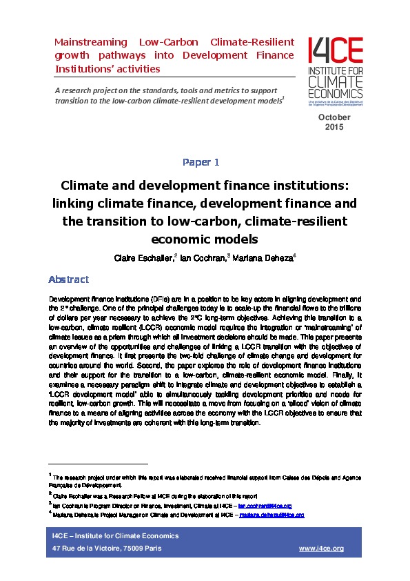 Le climat et les institutions financières du développement : relier la finance du climat et du développement et la transition vers une économie sobre en carbone et résiliente au changement climatique