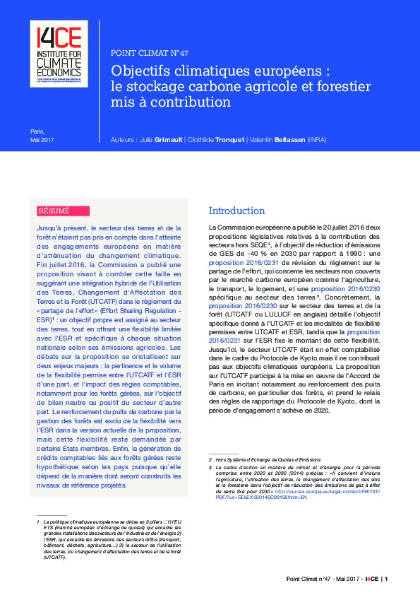 Fin juillet 2016, la Commission a publié une proposition visant à combler cette faille en suggérant une intégration hybride de l’Utilisation des Terres, Changement d’Affectation des Terres et la Forêt (UTCATF) dans le règlement du « partage de l’effort » (Effort Sharing Regulation – ESR) : un objectif propre est assigné au secteur des terres, tout en offrant une flexibilité limitée avec l’ESR et spécifique à chaque situation nationale selon ses émissions agricoles.