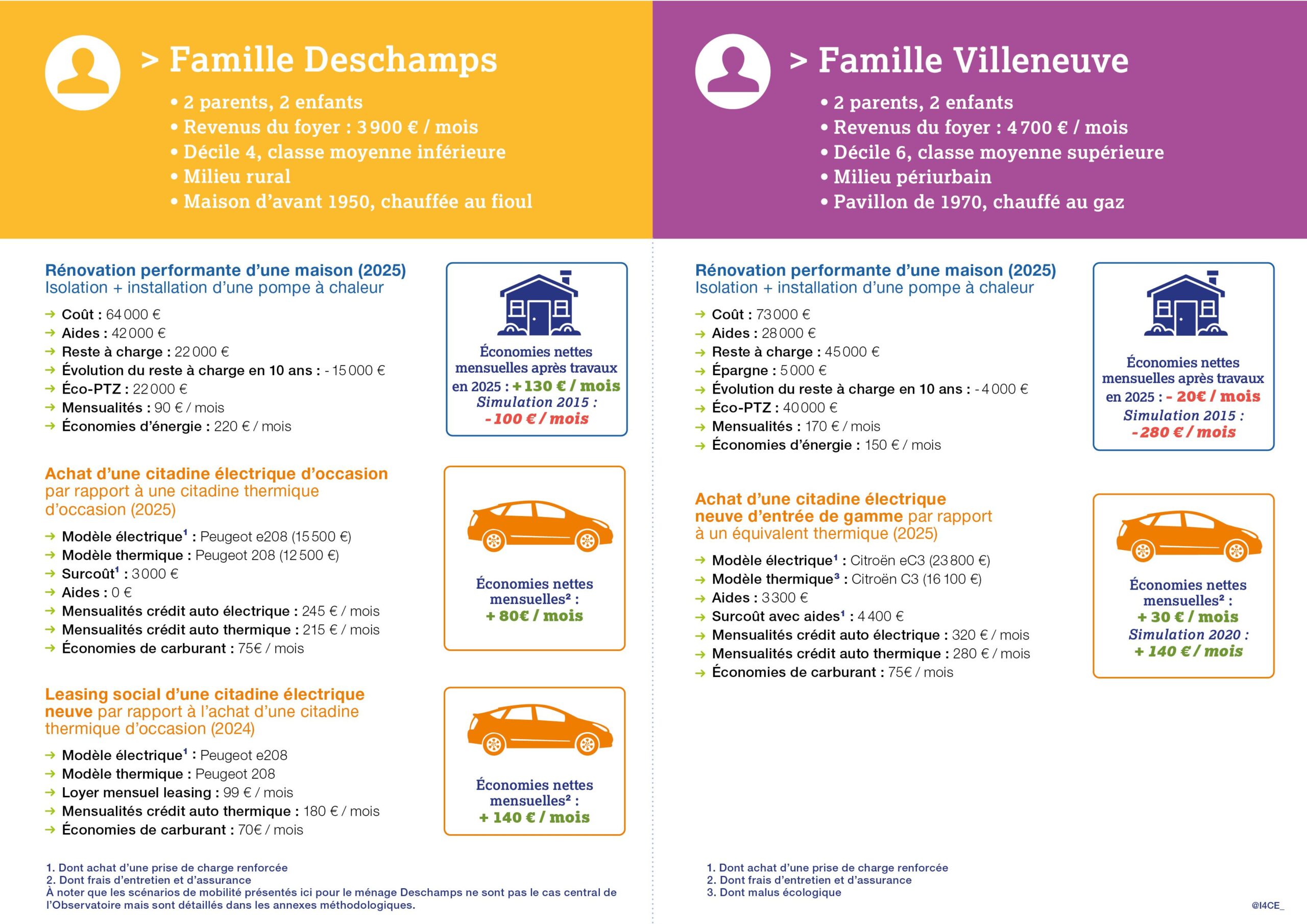 Nous présentons ces indicateurs pour deux ménages types : la famille Deschamps et la famille Villeneuve, toutes deux dans les classes moyennes, propriétaires de leur logement et dépendantes de la voiture au quotidien. Nous aurions pu présenter une multitude de profils types, mais nous avons choisi de nous concentrer sur un ménage rural de classe moyenne inférieure (la famille Deschamps) et un ménage périurbain de la classe moyenne supérieure (la famille Villeneuve). Ces deux ménages ne permettent évidemment pas de représenter la diversité des situations des ménages, ni même des classes moyennes. Il nous a semblé que ces deux profils permettaient toutefois d’évaluer des situations intéressantes, au cœur du débat politique. Nous avons évalué certains indicateurs dans d’autres configurations, et notamment dans le cas d’un ménage modeste et d’un ménage aisé. Ces analyses complémentaires sont évoquées au fil des pages de l’Observatoire et détaillées dans les annexes.