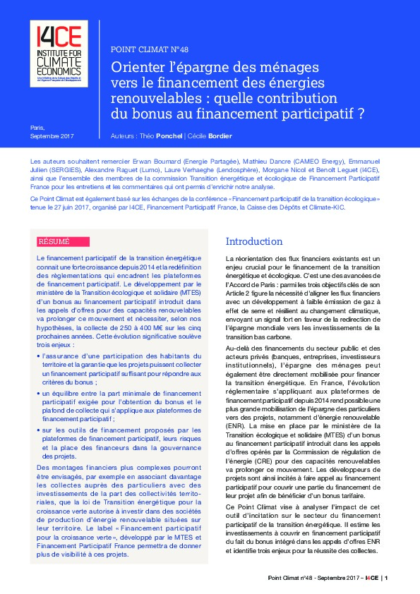 Orienter l’épargne des ménages vers le financement des énergies renouvelables : quelle contribution du bonus au financement participatif ? Télécharger