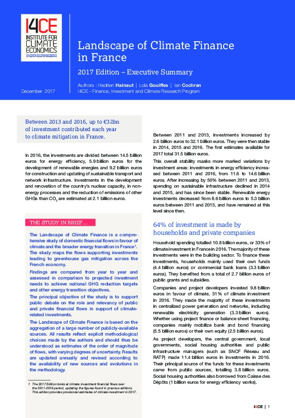 L’édition 2017 de l’étude recense jusqu’à 32 milliards d’euros investis en faveur du climat en France chaque année entre 2013 et 2016. Pour donner un ordre de grandeur, cela représente environ 10% des investissements matériels en France cette année-là. Ce total comprend: