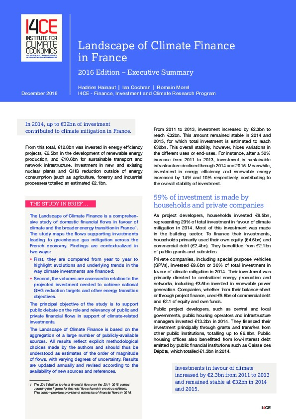 L’édition 2016 de l’étude recense jusqu’à 32 milliards d’euros investis en faveur du climat en France en 2014. Pour donner un ordre de grandeur, cela représente environ 10% des investissements matériels en France cette année-là. Ce total comprend
