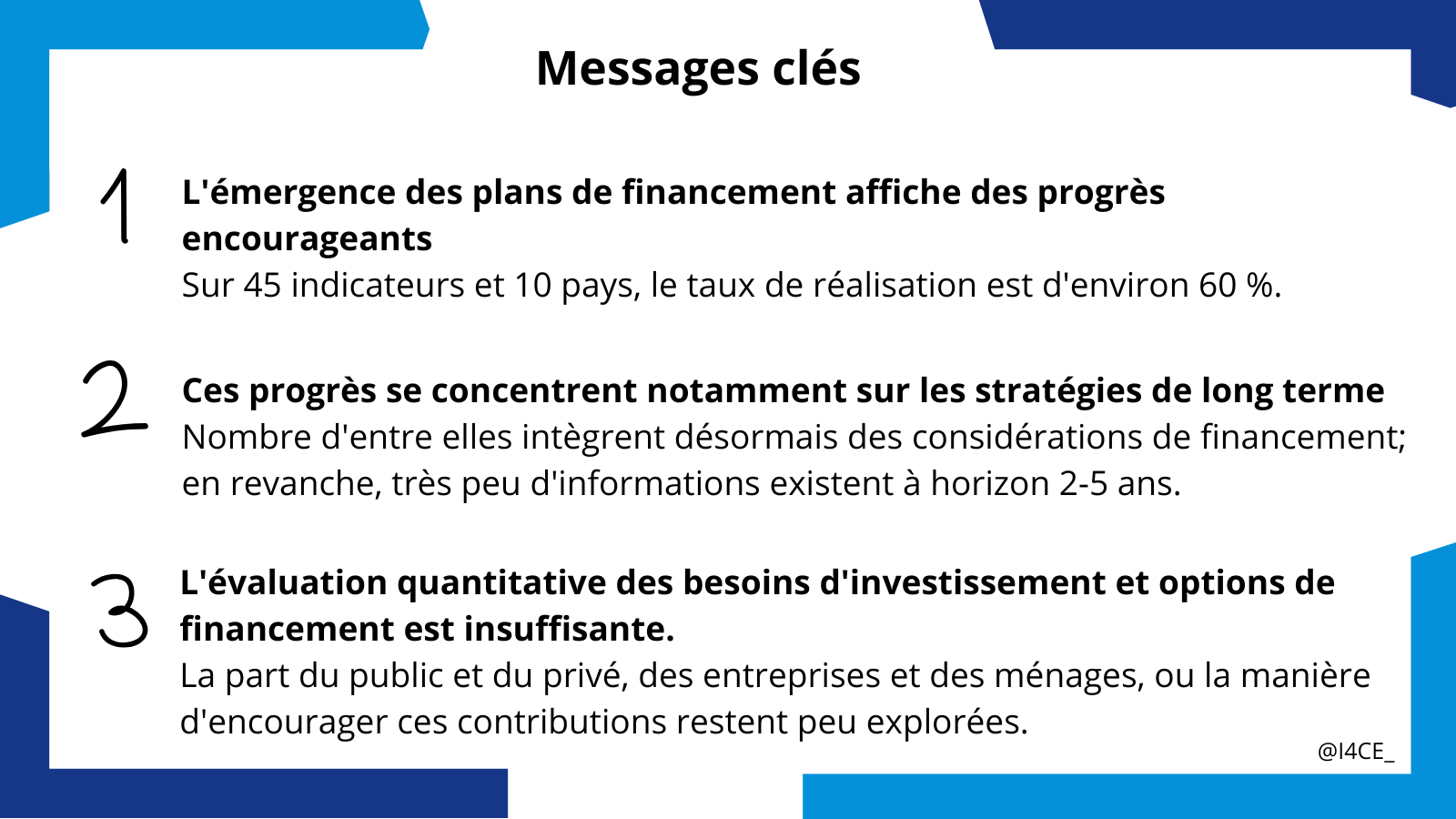 Cette première évaluation montre que de nombreuses étapes ont déjà été franchies sur la voie de plans de financement ambitieux : en moyenne, 60 % de nos indicateurs sont remplis dans les pays étudiés. Cependant, des lacunes importantes subsistent, des éléments clés étant encore absents ou sous-développés.