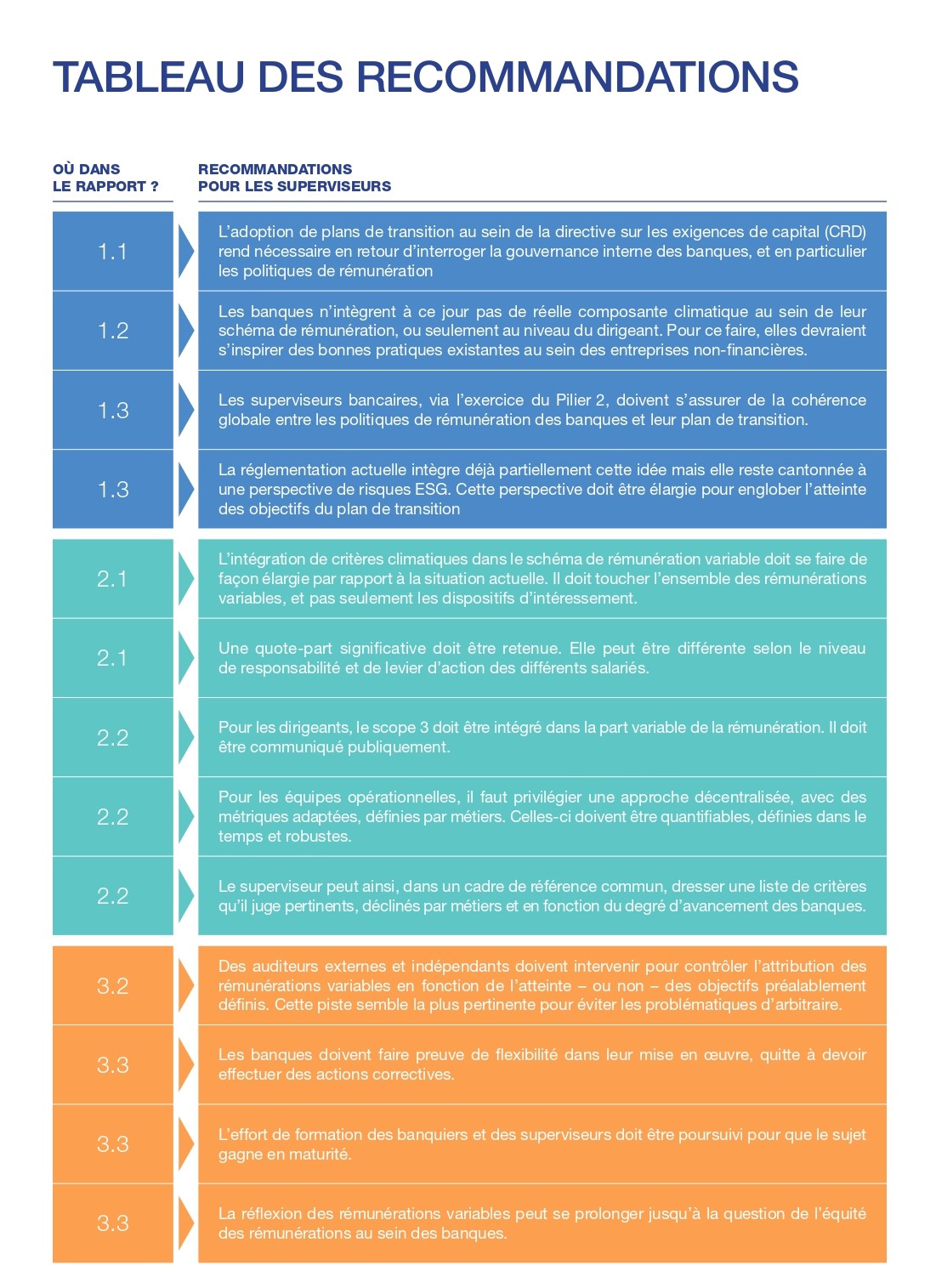 Dans ce rapport, I4CE explicite en quoi il est pourtant indispensable d’assurer la cohérence entre le plan de transition de la banque et les schémas de rémunération. En effet, si les rémunérations variables n’intègrent pas les objectifs du plan de transition de la banque, alors celui-ci a peu de chance d’être concrètement mis en œuvre. Au-delà du seul salaire des dirigeants, la question de l’intégration d’indicateurs climatiques dans les rémunérations doit également être étendue aux équipes opérationnelles. I4CE recommande aux superviseurs d’analyser plus en détails les pratiques des banques en la matière et d’en faire un levier d’action pour le déploiement du plan de transition.