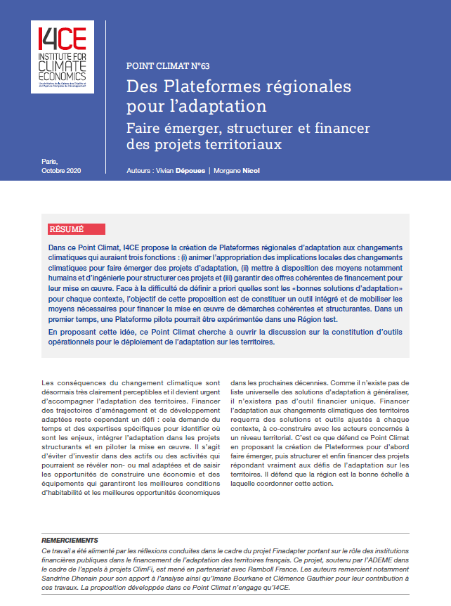 Dans ce Point Climat, I4CE propose la création de Plateformes régionales d’adaptation aux changements climatiques qui auraient trois fonctions.(1) animer l’appropriation des implications locales des changements climatiques pour faire émerger des projets d’adaptation, (2) mettre à disposition des moyens notamment humains et d’ingénierie pour structurer ces projets et (3) garantir des offres cohérentes de financement pour leur mise en œuvre.