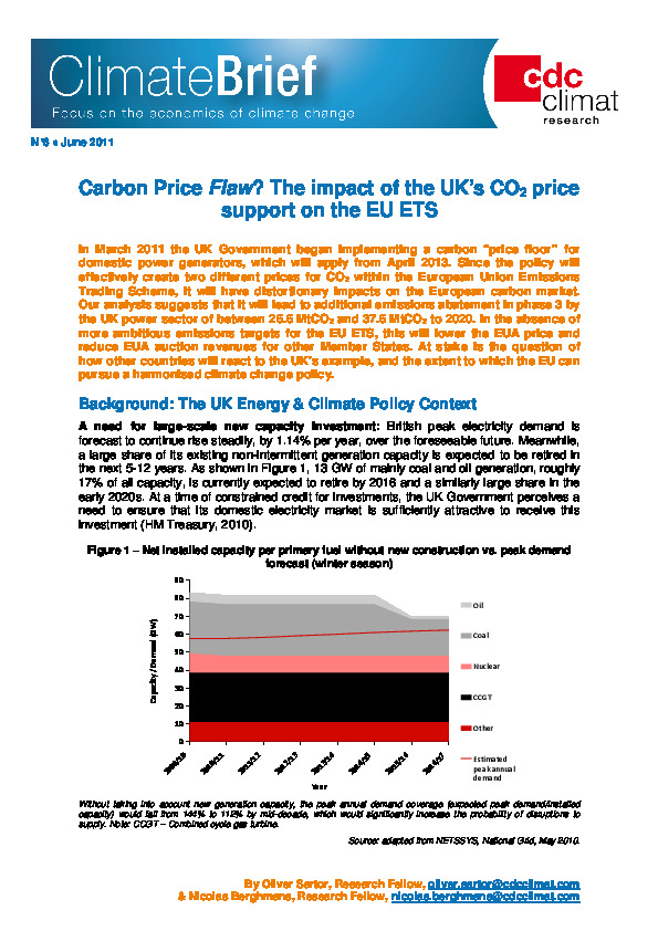 En mars 2011, le gouvernement britannique a engagé la mise en place d’un « prix plancher » du carbone pour ses producteurs nationaux d’électricité, qui s’appliquera à partir d’avril 2013. Dans les faits, cette politique créera deux prix différents pour le CO2 dans le Système communautaire d’échange de quotas d’émissions (EU ETS), générant des effets de distorsion sur le marché européen du carbone. Notre analyse suggère que cette mesure entraînera une réduction supplémentaire des émissions du secteur électrique britannique en phase 3, située entre 26,6 MtCO2 et 37,6 MtCO2 d’ici à 2020.