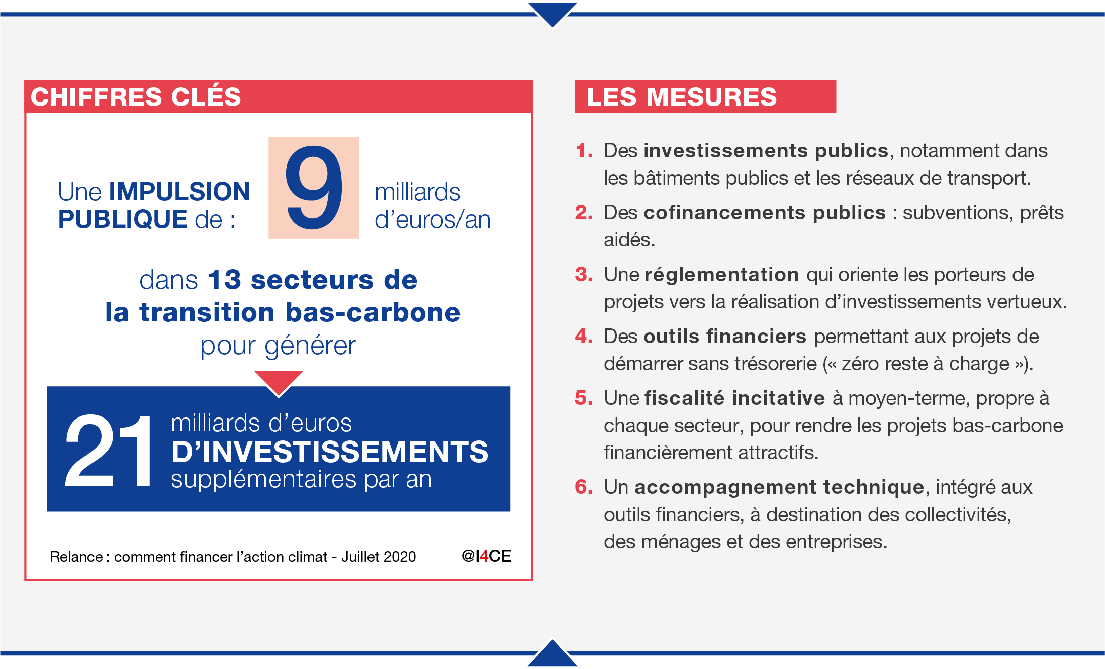 I4CE propose un plan permettant de déclencher 21 milliards d’investissements supplémentaires dans treize secteurs clés pour la transition bas carbone, dont certains n’ont fait l’objet d’aucune annonce gouvernementale, avec un financement public additionnel de 9 milliards par an. Mais le véritable enjeu financier sera d’augmenter cette effort dans la durée, les besoins augmentant alors que l’endettement ne sera bientôt plus une solution aussi facile qu’aujourd’hui.