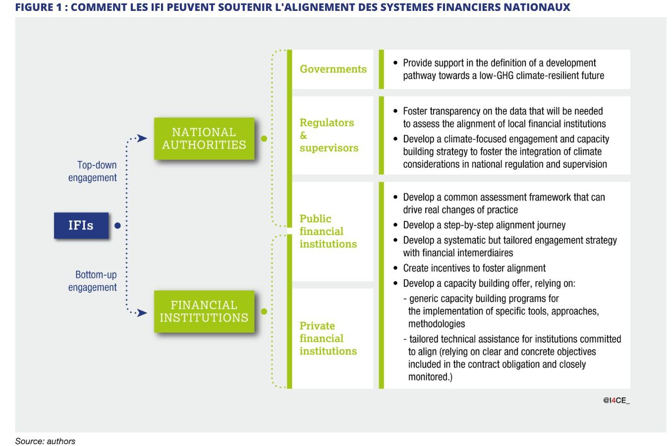Par ailleurs, les IFI disposent d’une importante expertise sur « comment » aligner une institution financière avec les objectifs climatiques, qu’elles peuvent transmettre à leurs partenaires. Pour guider les institutions et leur fournir les orientations les plus complètes possibles, les IFI peuvent s’appuyer sur les normes internationales existantes et à venir, telles que les recommandations de la Task Force on Climate-related Financial Disclosures (TCFD) ou les recommandations sur les plans de transition, mais aussi les cadres développés par les initiatives volontaires d’institutions financières sur l’intégration du climat. Les auteurs du rapport proposent dans ce rapport un parcours d’alignement, étape par étape, basé sur des actions à mettre en œuvre mais non prescriptives quant aux méthodologies et outils à utiliser.