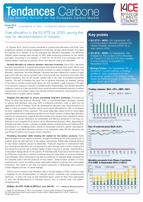 En Octobre 2014, le Conseil européen s’est engagé à poursuivre l’allocation gratuite de quotas en Phase IV de l’EU ETS (2021-2030), bien que depuis 2005 aucune analyse ne confirme l’existence de fuites de carbone. Pour répondre à cet engagement, le mécanisme d’allocation gratuite proposé en juillet 2015 par la Commission européenne serait-il suffisamment efficace pour limiter les fuites de carbone et favoriser l’émergence d’une industrie avec une faible intensité carbone ? Selon notre analyse[*], le mécanisme d’allocation gratuite devrait répondre à trois impératifs pour rester en cohérence avec la feuille de route de décarbonisation de long terme de l’industrie.