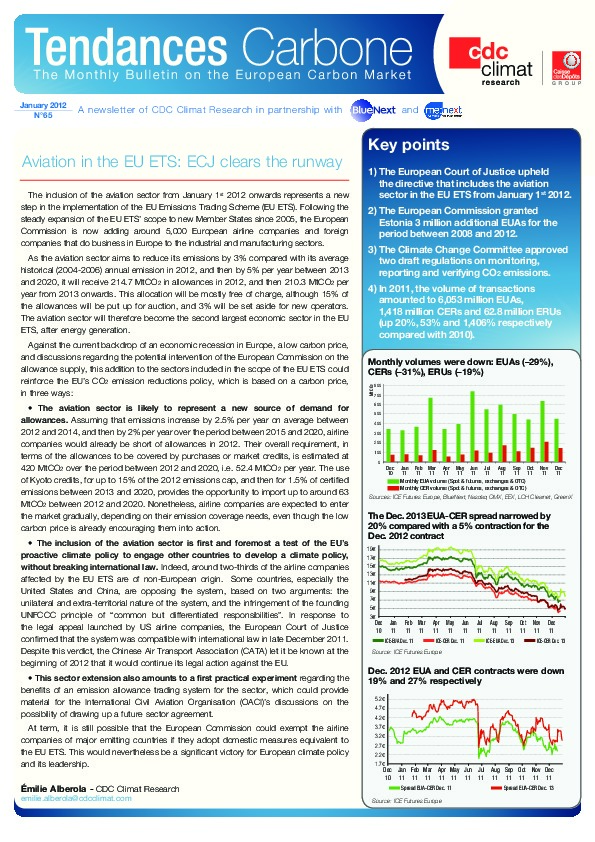 L’inclusion de l’aviation à partir du 1er janvier 2012 constitue une nouvelle étape dans la mise en oeuvre du système européen d’échange de quotas de CO2 (EU ETS). Après un élargissement progressif du périmètre de l’EU ETS depuis 2005 à de nouveaux États, la Commission européenne associe désormais aux industries énergétiques et manufacturières quelques 5 000 compagnies aériennes, européennes et étrangères, qui ont une activité en Europe.