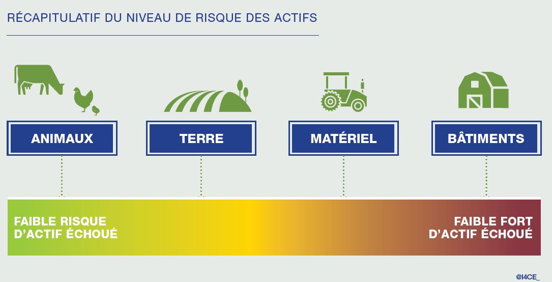 Or, quand un secteur économique voit son activité baisser, se pose également la question du devenir de ses outils de production actuellement en place et qui vont perdre de la valeur comparativement à un scénario de maintien de l’activité. On parle ici des « actifs à risque ». C’est une question particulièrement prégnante en agriculture puisque les exploitants investissent tout au long de leur vie dans leur exploitation avec la perspective d’une bonne valorisation de celle-ci au moment de sa session, afin de s’assurer une retraite décente.